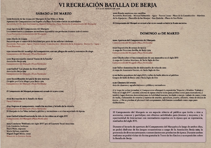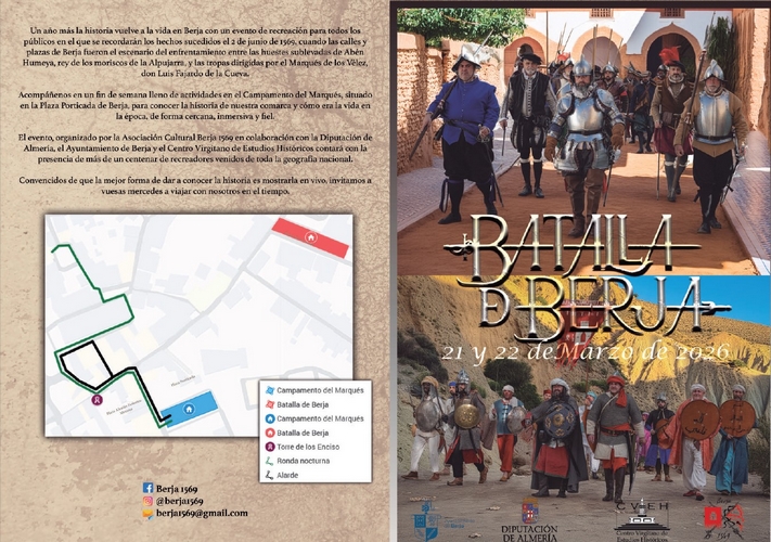 Un año más los virgitanos se vuelcan con la celebración de la Recreación Histórica de la Batalla de Berja con la que se recupera un capítulo fundamental de la Guerra de las Alpujarras en el siglo XVI. Aquella batalla fue determinante en la construcción de la Almería de la actualidad y durante este fin de semana, los días 21 y 22 de marzo, Berja recupera su historia y raíces con la VI edición de un evento que ya se ha convertido en imprescindible en el calendario cultural de la provincia.