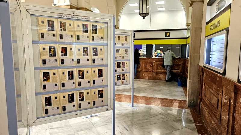 Exposición de sellos de nuestra historia medieval y nostálgicas tarjetas telefónicas en la oficina principal de Correos de Sevilla