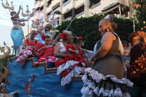 Y por supuesto, no han faltado las flores, las cuales iban tirando los integrantes de cada carroza, vestidos con trajes de gitana las mujeres y de corto los hombres. Y es que en la Feria de Almería, las únicas guerras que se libran, y ya lo decía Cristóbal Cervantes, pregonero de las fiestas de 2011, son de flores y claveles, que sirven solo para adornar la ciudad, para seguir embelleciéndola y que su color y su aroma se sumen al resto de adornos que Ayuntamiento, negocios y particulares han colocado en fachadas y escaparates para celebrar los días grandes de la capital en honor de la Virgen del Mar, la patrona de los almerienses.