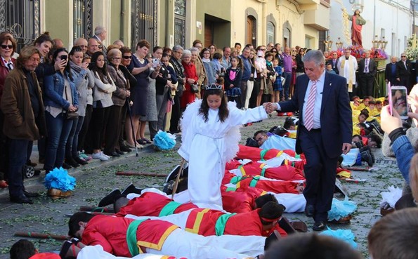 Un año más el ansiado Encuentro con el Resucitado, que tiene lugar en la Plaza de la Constitución de la villa gadorense, ha estado precedido por la costumbre de que el “Ángel” encarnado por una niña, pase sobre los cuerpos tendidos en el suelo de los judíos en señal de victoria sobre quienes han dado muerte a Jesús, simbolizando a través de la Resurrección el triunfo de la vida sobre la muerte.