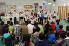 La actividad de talleres en las aulas se ha trasladado después hasta las pistas donde se han disputado varios partidos de futbol, en la modalidad masculina y femenina, entre los alumnos de ambos institutos. Después un descanso para reponer fuerzas tomando el desayuno mediterráneo a base de zumo de naranja, jamón y aceite y, como colofón, un festival de música intercultural en el gimnasio, con canciones, baile y entrega de premios.