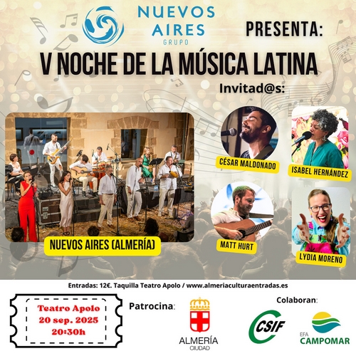 Por quinta vez, el inicio del otoño cultural de la capital almeriense adquiere sabor latino con la celebración del festival ‘La Noche de la Música Latina’. Un evento organizado por la Asociación Cultural Grupo Nuevos Aires que hace de esta cita con este género musical se consolide como una propuesta imprescindible y ya habitual para este trimestre en la programación de temporada del Área de Cultura del Ayuntamiento de Almería. Será este sábado, 20 de septiembre, a las 20.30 horas y en el Teatro Apolo. Este año, el grupo organizador (Nuevos Aires) hará un repaso por su trayectoria musical contando con diversos invitados para la ocasión; y continuará su apuesta por la solidaridad, cediendo parte de la recaudación a la Asociación Red Madre Almería.