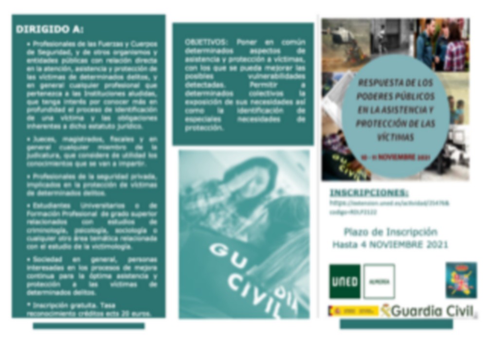 La comandancia de la Guardia Civil de Almería organiza junto al centro asociado de la Uned en Almería el curso “Respuesta de los poderes públicos en la asistencia y protección de las víctimas” los días 10 y 11 de noviembre próximos.