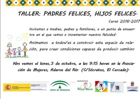 Este taller tiene un carácter totalmente interactivo, con una duración de al menos cinco sesiones pero que podrá alargarse en función de las necesidades e intereses de los participantes. Para este curso 2016/2017 se ha elegido el título ‘Padres Felices, Hijos Felices’, pues se pretende precisamente eso, contagiar la felicidad entre los propios miembros de la familia.