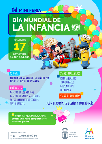 El Ayuntamiento de Huércal de Almería celebrará este domingo 17 de noviembre el Día Mundial de la Infancia con una serie de actividades que tendrán por marco el Parque de las Familias ‘Loquilandia’ de la localidad, con entrada libre hasta completar aforo. Entre ellas, se procederá a la lectura del manifiesto de UNICEF por los derechos de la infancia, un acto que tendrá lugar a las 12:00 horas.