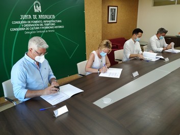 El alcalde, Ismael Torres, firma el acuerdo con la delegada de Fomento de la Junta de Andalucía, Eloísa Cabrera para la cesión de 1,6 kilómetros de la carretera A-1001 por parte del organismo autonómico.
