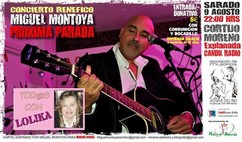 Una selección de sus más queridos temas editada bajo el título “Próxima parada” cuya presentación se llevó a cabo a principios de verano en la Asociación Cultural “La Canastera”, y con la que esté sábado Miguel se volverá a subir a un escenario, en colaboración con la Asociación de Mujeres “Adarve del Río” y del Ayuntamiento de Huércal de Almería, en apoyo a Lolika. Un concierto benéfico en primicia, cuya recaudación será destinada a la ayuda a Lola par su operación, pensado para llegar a todo tipo de público. Junto con la presentación de las principales canciones del CD “Próxima parada”, se tocarán temas Pop/Rock al más puro estilo Revolver, pasando por versiones de los Secretos, The Police o La Guardia, junto con una parte más íntima y romántica compuesta por boleros, basonovas y bachatas. Un suculento repertorio en el que Miguel Montoya contará con la ayuda y participación de artistas como: Lidia Plaza, Chochi Dure, Luismi Morales, Mateo García, Julio Carasa, Juanma Zeas y Rafael Rodríguez.