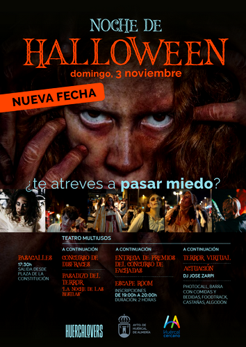 Entre estas actividades estaba prevista la celebración de la Noche de Halloween este jueves 31 de octubre, con varias propuestas como los tradicionales pasacalles, pasadizo del terror, escape room, terror virtual y entrega de premios de los concursos de disfraces y fachadas. Todas estas actividades han sido trasladadas por el Ayuntamiento de Huércal de Almería al próximo domingo 3 de noviembre, ya pasados los tres días de luto oficial, y adelantando la hora de comienzo a las 17:30 horas de la tarde.