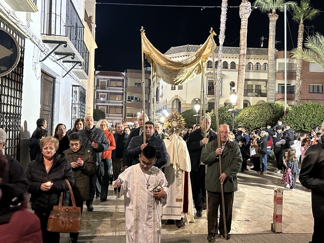 Al paso de la procesión se fueron encendiendo candelas y lumbres en la Plaza de Abastos, Plaza Obispo Ginés G. Beltrán, y en las Glorietas. El acompañamiento musical corrió a cargo de la Asociación Musical Virgen del Río.