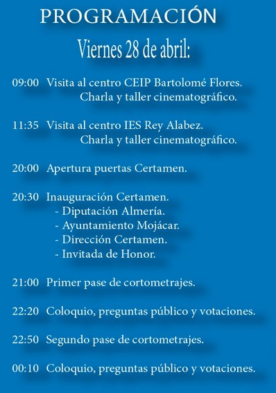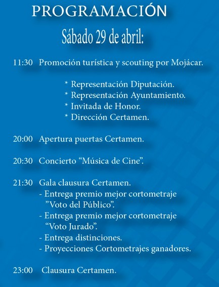 Ayuntamiento de Mojácar II Certamen de cortometrajes “Ciudad de Mojácar” 24/04/2023 Programación del II Certamen de Cortometrajes que tendrá lugar los días 28 y 29 de abril en el CENTRO DE USOS MÚLTIPLES de Mojácar. Tags: ayuntamiento de Mojácar Continue Reading Previous: MOJÁCAR rinde homenaje a Diego Martínez Melgares en la I Gala FederbandNext: La Plolicía Local de Mojácar recupera un vehículo sustraido en Sevilla y detiene a sus 4 ocupantes Noticias relacionadas El Ayuntamiento de Mojácar refuerza la seguridad y la protección a las víctimas de violencia de género Ayuntamiento de Mojácar Última Hora El Ayuntamiento de Mojácar refuerza la seguridad y la protección a las víctimas de violencia de género 24/04/2026 Mojácar celebra el Día del Libro 2026 con una ambiciosa programación cultural para todas las edades Ayuntamiento de Mojácar Última Hora Mojácar celebra el Día del Libro 2026 con una ambiciosa programación cultural para todas las edades 23/04/2026 EL Ayuntamiento de Mojácar acoge el estreno del documental “HACIA EL BOSQUE” una mirada sensorial y científica sobre el autismo Ayuntamiento de Mojácar Última Hora EL Ayuntamiento de Mojácar acoge el estreno del documental “HACIA EL BOSQUE” una mirada sensorial y científica sobre el autismo 23/04/2026 El delegado de Agricultura realiza una visita a las actuaciones hidráulicas en Mojácar Ayuntamiento de Mojácar Junta de Andalucía El delegado de Agricultura realiza una visita a las actuaciones hidráulicas en Mojácar 15/04/2026 El PP destaca la “transformación histórica de Mojácar” con una inversión de casi 50 millones del Gobierno de Juanma Moreno en 7 años Almería Ayuntamiento de Mojácar Última Hora El PP destaca la “transformación histórica de Mojácar” con una inversión de casi 50 millones del Gobierno de Juanma Moreno en 7 años 14/04/2026 Mojácar traslada ‘Moros y Cristianos’ a Almería para presentar sus Fiestas 2026 Ayuntamiento de Almería Ayuntamiento de Mojácar Diputación de Almería Junta de Andalucía Última Hora Mojácar traslada ‘Moros y Cristianos’ a Almería para presentar sus Fiestas 2026 10/04/2026