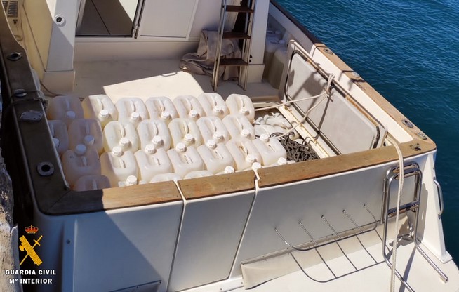 En la primera actuación, el personal de la Guardia Civil durante sus patrullas de inspección en puertos recreativos identifica una embarcación atracada en el Puerto Deportivo de Aguadulce-Roquetas de Mar (Almería) y localiza 130 garrafas de combustible de 25 litros cada una (3.250 litros) por lo que se propone para sanción ante la Administración de Aduanas e Impuestos Especiales por una infracción de contrabando.
