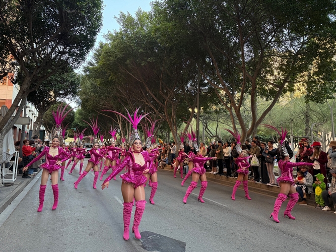 La fiesta del color, la alegría y el ingenio del Carnaval de Almería, organizada por la Federación Municipal de Carnaval de Almería (FEMACA) con la colaboración del Área de Cultura del Ayuntamiento de Almería, ha continuado esta tarde con el desfile y cabalgata del Carnaval, desde el Anfiteatro de la Rambla. Ha bajado desde la Avenida Federico García Lorca hasta la Plaza de las Velas, emprendiendo la subida hasta la carpa del Mirador de la Rambla, donde habrá batalla de papelillos, batucada, concursos y actuaciones de agrupaciones.