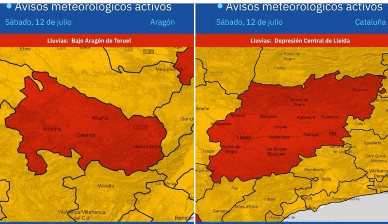 12/07/2025 La AEMET activa el aviso rojo por lluvias torrenciales en Bajo Aragón de Teruel y Depresión Central de Lleida. La Agencia Estatal de Meteorología (AEMET) ha activado este sábado el aviso rojo por lluvias de intensidad torrencial en el Bajo Aragón de Teruel y en la Depresión Central de Lleida. ESPAÑA EUROPA MADRID SOCIEDAD