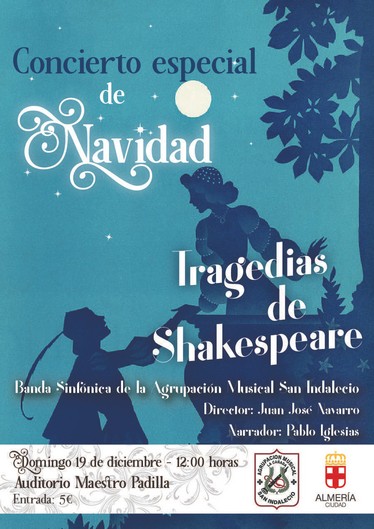 La música clásica es uno de los puntos fuertes de la programación especial de Navidad cada año y, desde su nacimiento, la Agrupación Musical San Indalecio es una de las formaciones que siempre aportan su saber hacer dentro de las actividades organizadas por el Área de Cultura y Educación del Ayuntamiento de Almería para estas fechas. En el caso de esta edición de #AlmeriaESnavidad, la cita será con su Banda Sinfónica, este domingo, 19 de diciembre, a las 12.00 horas y en el Auditorio Municipal Maestro Padilla con el concierto ‘Tragedias de Shakespeare’. Dirigidos por Juan José Navarro, la Agrupación contará con la colaboración en la narración de Pablo Iglesias.