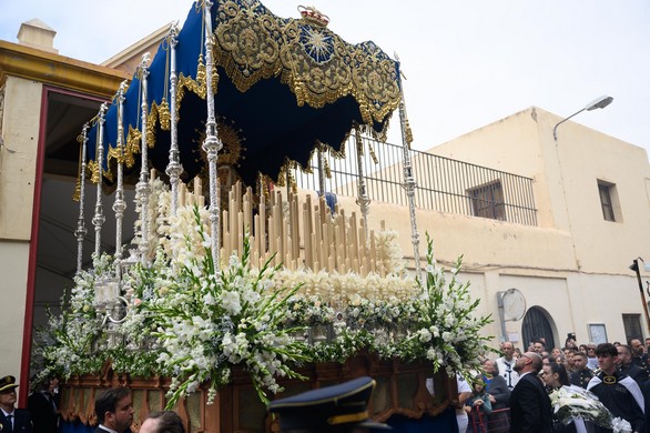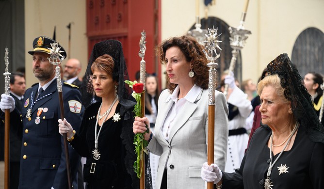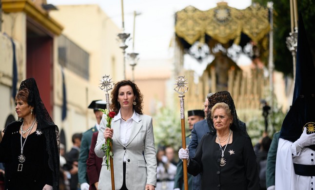 Acompañada por los concejales del Equipo de Gobierno Diego Cruz y Sacra Sánchez y por el hermano mayor, Rubén Ibán Verdegay, la regidora almeriense ha realizado la levantá de los dos pasos de la Hermandad y ha pedido por los enfermos de Almería antes de acompañar a las imágenes en su salida en procesión arropadas por un manto de pétalos lanzados desde el aire por los fieles.
