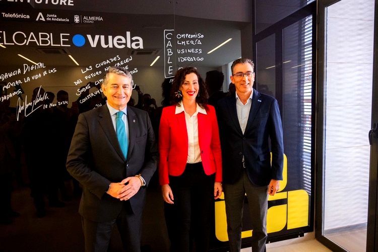 La alcaldesa de Almería, María del Mar Vázquez, y el consejero de Presidencia, Interior, Diálogo Social y Simplificación Administrativa de la Junta de Andalucía, Antonio Sanz, han visitado este lunes la sede de ‘El Cable Vuela’ – Andalucía Open Future, donde actualmente hay cinco ‘startups’ en aceleración. Proyectos pioneros y futurísticos que ambos han conocido en primera persona acompañados por Joaquín Segovia, director del Territorio Sur de Telefónica España y por Diana Melero, directora de ‘El Cable’.