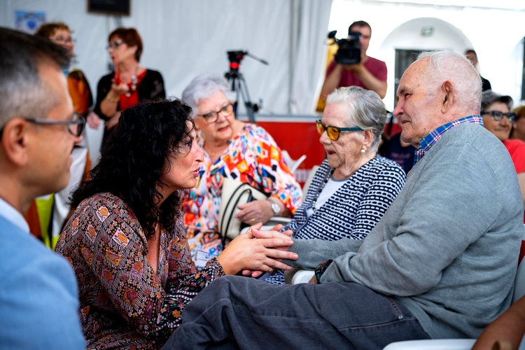 María del Mar Vázquez asiste al homenaje que Regiones y su asociación de vecinos ha rendido a Elvira Alonso (97 años) y Francisco Borbalán (93 años), dos de los primeros vecinos residentes en este barrio surgido en 1944