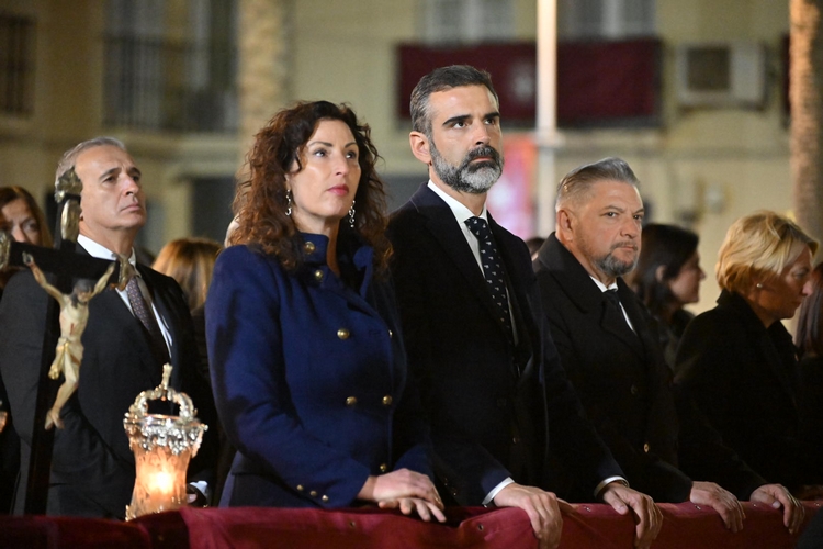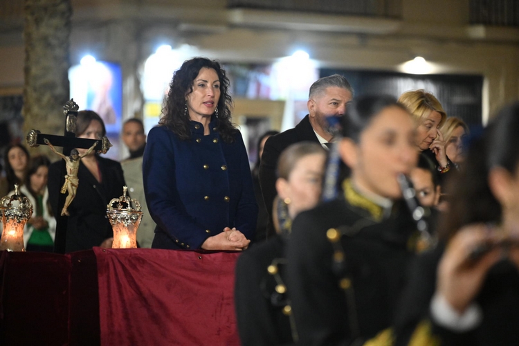 Acompañada de los concejales Diego Cruz, Eloísa Cabrera, Lorena Nieto y Óscar Bleda, así como del presidente de la Agrupación de Hermandades y Cofradías de Almería, José Rafael Soto, y de miembros de su Junta de Gobierno, la alcaldesa ha seguido el paso de todos los pasos que han procesionado este Miércoles Santo desde la tribuna de la Plaza de la Catedral.