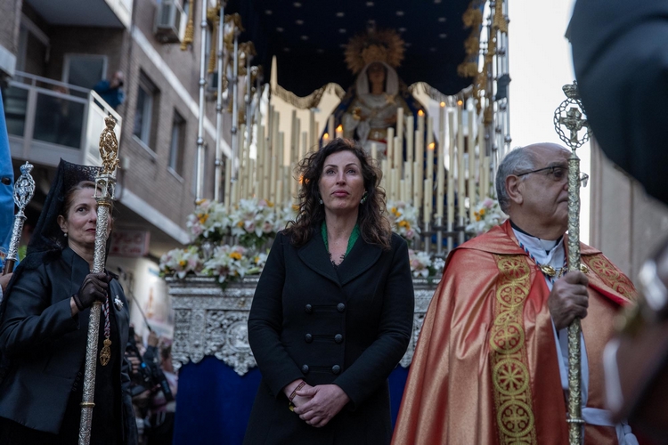 La alcaldesa de Almería, María del Mar Vázquez, ha realizado las levantás del Santísimo Cristo del Amor y Nuestra Señora del Primer Dolor a su salida de la Iglesia Parroquial de San Sebastián en este Martes Santo.