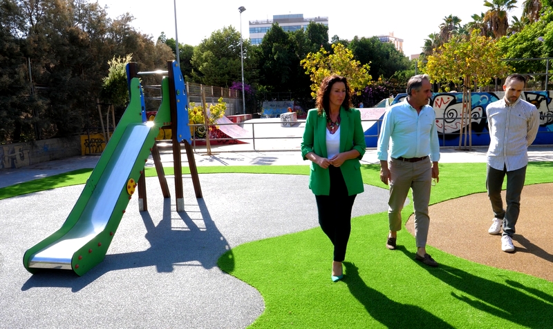 Acompañada por el concejal de Agricultura, Agua y Zonas Verdes, Juan José Segura, y por técnicos del Área, la alcaldesa ha comprobado el resultado de unos trabajos que han consistido en la retirada del suelo calcinado, FOAM y césped artificial, con una superficie de 345 m²; en la reposición de los juegos infantiles y demás elementos que componen el área, como asientos planos y cestas de bebe, con sus cadenas nuevas; así como en la instalación de pavimento de seguridad en una superficie de 206 m² (compuesto de SBR y EPDM, gránulos de caucho para amortiguar la zona y con un diseño de hojas), y en la instalación de pavimento continuo de césped artificial, con la integración del escudo de Almería, con superficie de 139 m².