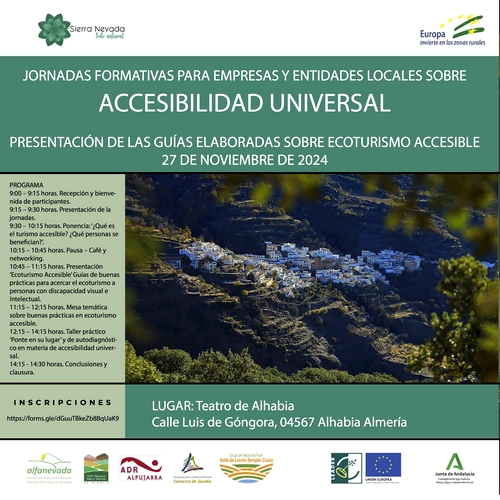 El próximo 27 de noviembre de 2024, el Teatro de Alhabia, ubicado en la calle Luis de Góngora S/N, en el municipio almeriense de Alhabia, acoge una jornada formativa enfocada en la accesibilidad universal, especialmente en el sector ecoturístico, dirigida a empresas y entidades locales. Este evento tiene como objetivo sensibilizar y formar a los profesionales del sector sobre la importancia de integrar la accesibilidad en la oferta turística, favoreciendo la inclusión de personas con discapacidad, en particular las personas con discapacidad visual e intelectual.