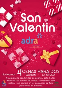 Con motivo de la celebración del 14 de febrero, Día de San Valentín o comúnmente conocido como ‘Día de los enamorados’, la Asociación de Comerciantes de Adra ha organizado un sorteo de cuatro cenas a canjear en dos restaurantes de Adra, Garum y La Granja. Se participará con los tiquets de las compras efectuadas en los comercios adheridos desde el 4 hasta el 14 de febrero. Ese mismo día, en la Plaza Enrique Sierra Valenzuela se instalará una urna de 10:00 a 13:30 horas para depositar los tiquets, y a las 13:30 horas se procederá al sorteo.