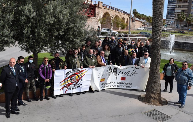 Un año más la Asociación Murciana de Víctimas del Terrorismo, junto al Grupo de Motoristas Águilas Verdes, han realizado una ruta motera que les ha llevado a distintos puntos de la provincia y ha concluido en la ciudad de Almería, donde han visitado el Parque dedicado a las Victimas del Terrorismo. Junto al Monolito, les han recibido el concejal de Promoción de la Ciudad, Carlos Sánchez, y el concejal de Cultura, Diego Cruz.