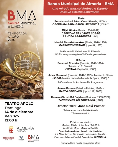 La Banda Municipal de Música de Almería ofrecerá este próximo domingo, 14 de diciembre, su penúltimo concierto del año. Será el último de la temporada de otoño coordinada por el Área de Cultura del Ayuntamiento de Almería en el Teatro Apolo, a las 12.00 horas, y con entrada libre hasta completar aforo. Bajo el título de ‘Una mirada musical foránea a España, más un estreno almeriense’ la Banda contará con la dirección de su titular José Solá Palmer.