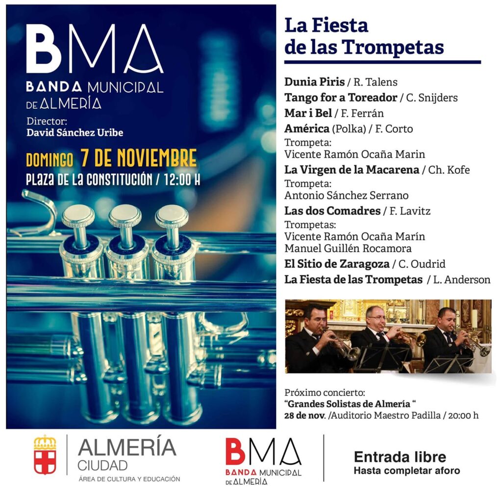 La Banda Municipal de Música de Almería continúa saliendo al encuentro del público con un nuevo concierto perteneciente a la temporada de otoño programada por el Área de Cultura y Educación del Ayuntamiento de Almería. Si el primero de este trimestre fue un recorrido por piezas de inspiración regional y el segundo por los musicales más conocidos y populares de Andrew Lloyd Webber, en esta ocasión el concierto se denomina ‘La Fiesta de las Trompetas’.