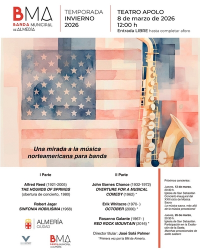 La Banda Municipal de Música de Almería ofrecerá este domingo, 8 de marzo, el cuarto y último de sus conciertos de temporada de invierno en el Teatro Apolo tras las citas de los pasados 25 de enero y 8 y 22 de febrero. En esta ocasión será bajo el título de ‘Una mirada a la música norteamericana para banda’ y, como es habitual, contará con la dirección de su titular José Solá Palmer, comenzará a las 12.00 horas del mediodía y la entrada será libre hasta completar aforo, en el marco de la programación trimestral puesta en marcha por el Área de Cultura, Tradiciones y Educación del Ayuntamiento de Almería.