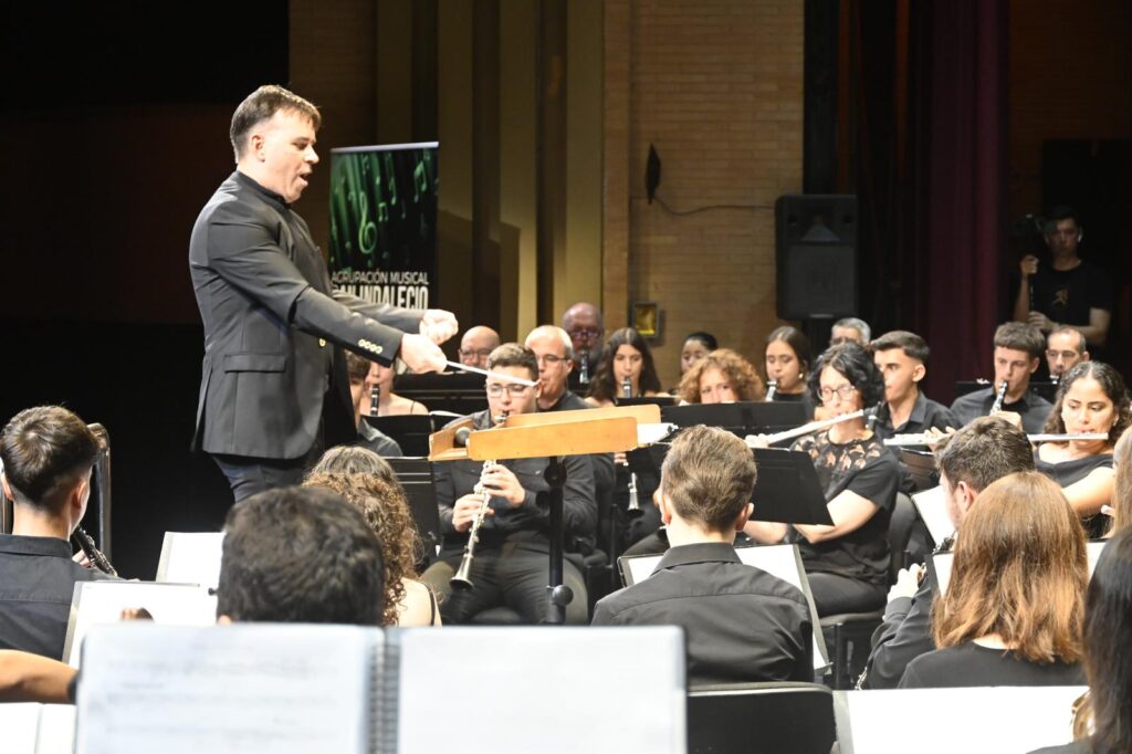 La Banda San Indalecio continuó con un clásico de la zarzuela como es “La Torre del Oro”, del maestro Gerónimo Giménez, y siguió con uno de los platos fuertes del concierto, el estreno de la obra “Sincronía Nº1 en Si bemol”, del compositor valenciano Josep Miquel. Una obra que resume su trayectoria como compositor, con varias citas a sus obras más representativas y que representa a la perfección su estilo. Un composición de nuevas y modernas sonoridades, en la que la Banda Sinfónica sobresalió por su capacidad para interpretar a la perfección el tempo y los matices de esta obra. El broche de oro fue la interpretación de la primera parte de las “Danzas Armenias” del laureado compositor Alfred Reed, uno de los compositores más prolíficos para bandas de música. Una obra con continuos cambios de ritmo y combinaciones tímbricas, en la que el talento de los jóvenes músicos de nuevo brilló, recibiendo los aplausos de un público entregado.