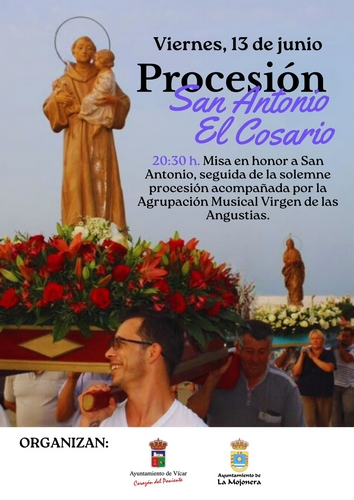 La veneración de San Antonio es una celebración especial donde los municipios de Vícar y La Mojonera comparten espacio y vecindad con motivo de tal fecha. Así, la capilla de El Cosario recibirá a los fieles a partir de las 20.30h en una solemne misa de la que participarán tanto representantes municipales de ambos municipios como conjunto social del barrio.