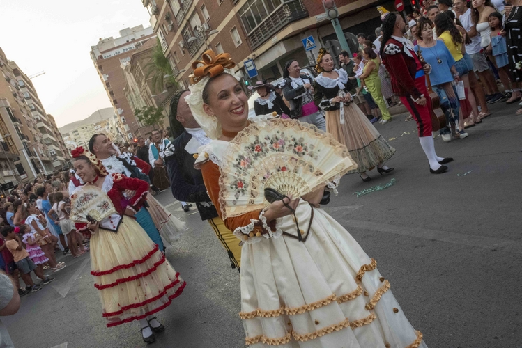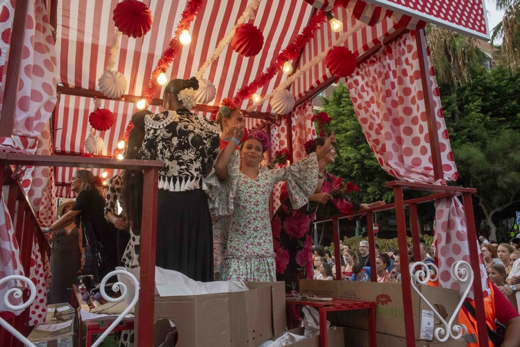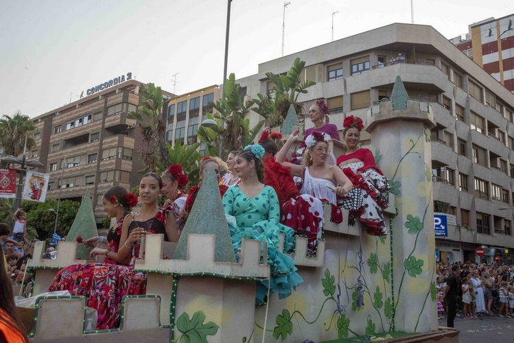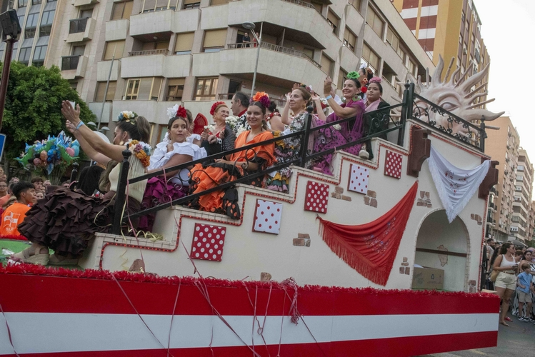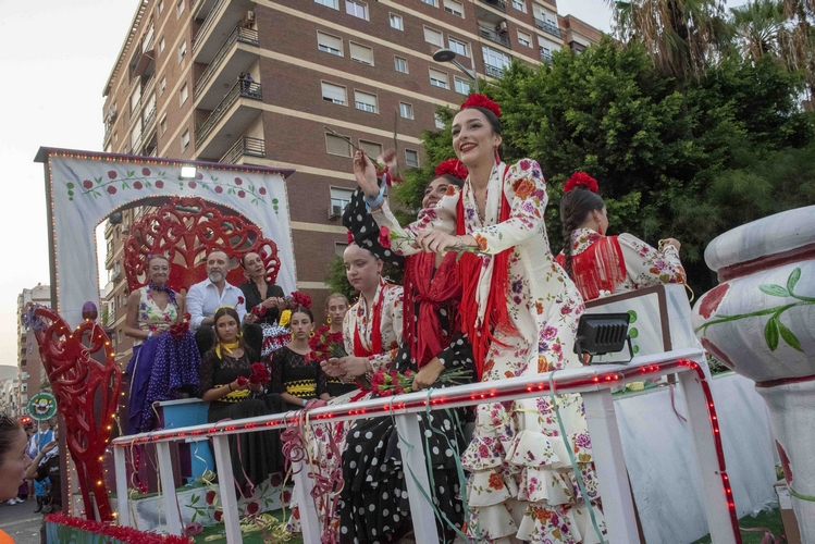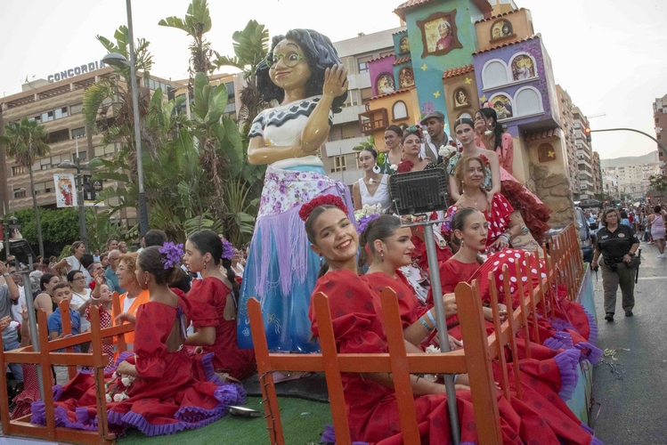 Uno de los momentos más celebrados ha sido la presencia de la primera de las dos carrozas que rescatan la indumentaria tradicional almeriense. Protagonizada por la Agrupación Folclórica Alcazaba ha enseñado las características de la vestimenta de nuestros antepasados, la misma que se explicará en el certamen el próximo miércoles, y como telón de fondo la Alcazaba. La carroza que cerraba el desfile, diseñada con el costumbrismo de la Peineta, ha trasladado a los vecinos de la asociación Villa Carmen, también con la indumentaria tradicional.