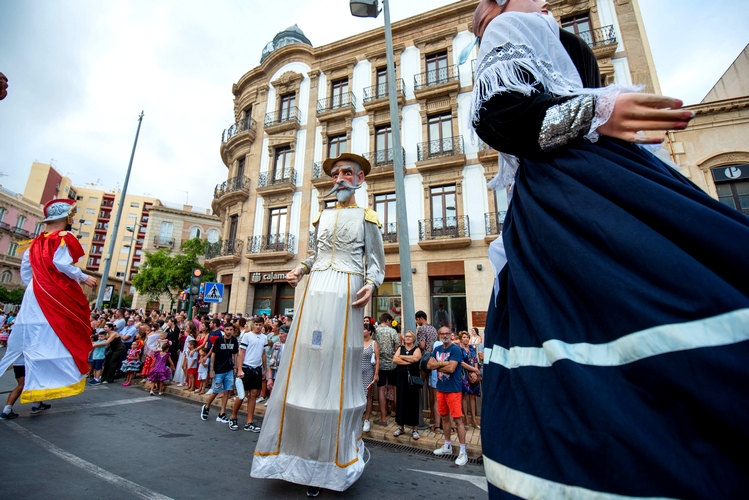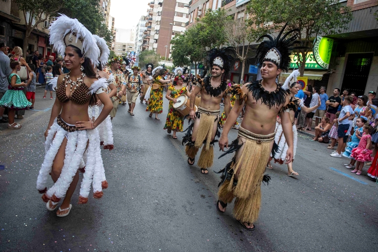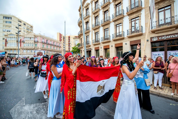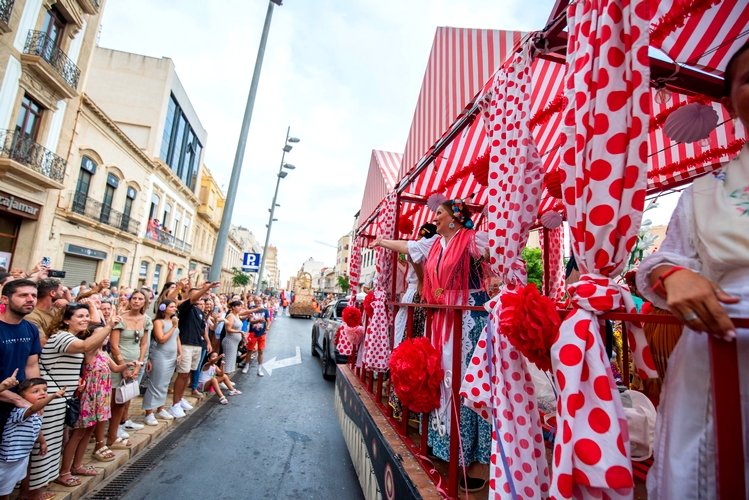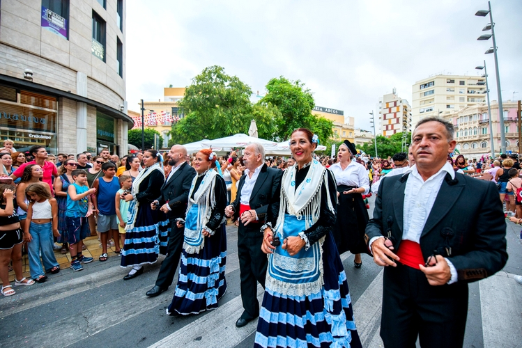 La cabalgata transcurre con doce carrozas, tres con el vestuario tradicional almeriense, y el baile de grupos del 39º Festival de Folclore