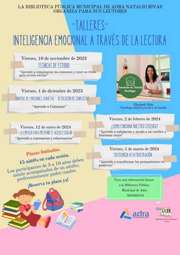 El Ayuntamiento de Adra a través de la Biblioteca Municipal Natalio Rivas ha organizado para los jóvenes amantes de los libros cinco talleres de ‘Inteligencia Emocional a través de la Lectura’ que se llevarán a cabo en las instalaciones de la Biblioteca en jornadas diferentes repartidas desde el 10 de noviembre al 1 de marzo. Estos talleres, impartidos por la psicóloga infantil-juvenil y de familia, Elisabet Ruiz, están destinados a los más jóvenes de la ciudad. Los niños y niñas de 5 a 10 años que asistan deberán estar acompañados de un adulto, preferentemente padre o madre. Las plazas son limitadas, con 15 participantes en cada sesión, que deberán apuntarse en el edificio de la Biblioteca Municipal o llamando al 950 560 154.