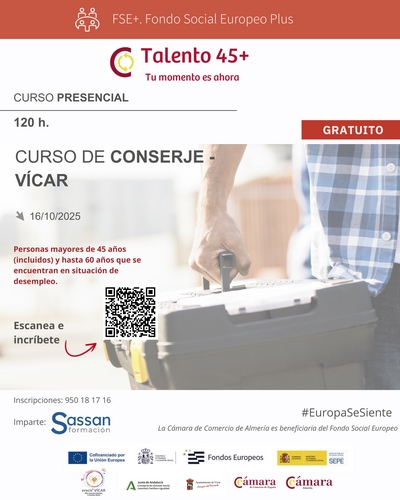La Cámara de Comercio de Almería, a través de Talento 45+ del Fondo Social Europeo Plus, organiza un curso formativo para ser conserje que se va a desarrollar en el mes de octubre en Vícar, en el que colabora además el grupo Eracis+ de Vícar. El curso está dirigido a personas que se encuentren en situación de desempleo y con edades comprendidas entre los 45 y los 60 años. Para el alcalde de Vícar, Antonio Bonilla, “es importante mantener nuestra predisposición a colaborar en cuantas iniciativas de ámbito formativo y social se llevan a cabo en el municipio por parte de los diferentes colectivos, asociaciones o instituciones”.