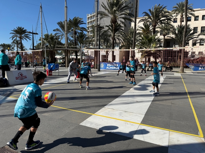 El Ayuntamiento de Almería lo tiene claro. Quiere una ciudad activa, y hoy se ha vuelto a demostrar, entre otras iniciativas, con el entrenamiento al aire libre de los niños y niñas de los equipos alevín y benjamín del club Mintonette de voleibol, que han trasladado sus sesiones en el Palacio de los Juegos Mediterráneos al centro de la ciudad, para fomentar este deporte y, a la vez, promocionar el gran evento con el que se cerrará el año, el Campeonato de España de Voleibol Cadete, que reunirá en Almería y provincia, del 27 al 30 de diciembre, a 230 equipos y más de 3.500 jugadores, lo que supondrá un mínimo de 30.000 pernoctaciones, y generará importantes beneficios para la hostelería y el comercio de la ciudad.