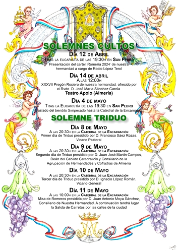 Después de la presentación del cartel anunciador de la Romería 2024, que realizó Rocío López Terol sobre una pintura compuesta por Carlos Llanos (ReysPerú); y del XXXVII Pregón Rociero que corrió a cargo del sacerdote José María Sánchez, la corporación ya está inmersa en los cultos previos a un nuevo Pentecostés.