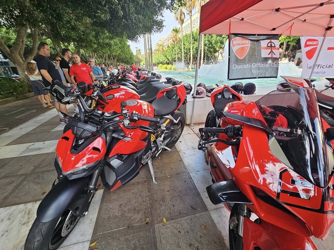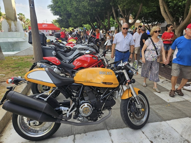 La Feria de Almería tiene numerosos ingredientes cada día para hacer un menú variado y al gusto de todas las aficiones. Desde hace casi treinta años y consolidado en los últimos tiempos en el domingo de Feria, una de las citas clásicas es la doble concentración de motos antiguas y ‘Ducati’ que esta mañana se han expuesto durante casi tres horas alrededor de la fuente del primer obelisco de la Avenida Federico García Lorca, en la intersección con la calle Santos Zárate. Una convocatoria incluida dentro de la programación especial de Feria que coordina el Área de Cultura, Tradiciones y Fiestas Mayores del Ayuntamiento de Almería.