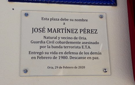 En la placa de homenaje reza lo siguiente: “ESTA PLAZA DEBE SU NOMBRE A JOSÉ MARTÍNEZ PÉREZ, NATURAL Y VECINO DE ORIA, GUARDIA CIVIL COBARDEMENTE ASESINADO POR LA BANDA TERRORISTA E.T.A. – ENTREGÓ SU VIDA EN DEFENSA DE LOS DEMÁS EN FEBRERO DE 1980. DESCANSE EN PAZ. ORIA, 29 DE FEBRERO DE 2020”.