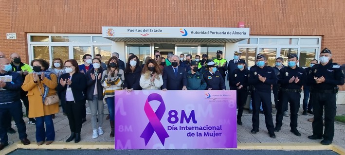 Convocados por la Autoridad Portuaria de Almería, la plantilla y el comité de empresa de la APA, así como representantes de empresas e instituciones de la Comunidad Portuaria han celebrado el Día Internacional de la Mujer con una concentración ante la puerta de las oficinas del organismo público, presidida por un cartel conmemorativo de la fecha, que este año se celebra con el lema ‘Igualdad de género hoy para un mañana sostenible’.
