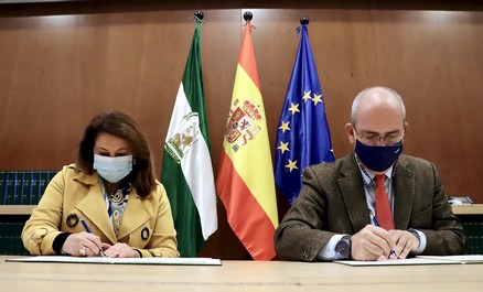 La consejera de Agricultura, Ganadería, Pesca y Desarrollo Sostenible, Carmen Crespo, y el presidente de las Cámaras de Comercio de Andalucía, Javier Sánchez Rojas, han firmado un convenio dirigido al desarrollo de actuaciones que persiguen el fomento de la innovación, la digitalización, la promoción y la internacionalización de la agroindustria andaluza. Carmen Crespo ha apuntado que, a través de esta iniciativa, la Junta de Andalucía y las Cámaras de Comercio buscan impulsar una actividad prioritaria para la sociedad como es el sector agroalimentario, “que está mostrando su implicación durante unos complicados meses de pandemia” en los que no se ha visto alterado el abastecimiento de la población “gracias a su esfuerzo y dedicación”.
