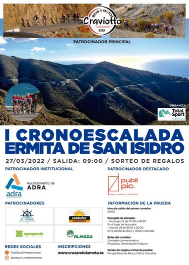 150 ciclistas llegados desde toda la provincia y otras vecinas se darán cita este domingo en Adra en la I Cronoescalada a la Ermita de San Isidro, primera contrarreloj del año en la provincia de Almería, y que recupera para el calendario ciclista la conocida Subida a la Parra. La prueba está organizada por Total Sport Mediterranean junto con el Ayuntamiento de Adra y cuenta además con el patrocinio principal de Bicis y Motos Craviotto, además del patrocinio de Publipic y la colaboración de Café Bar Restaurante El Timón, Suministros Soldufer, Agrogarcía y Almesu.