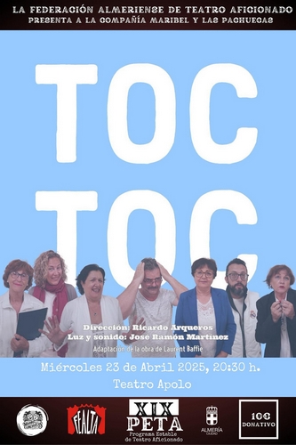 El Programa Estable de Teatro Aficionado que realiza de manera conjunta la Federación Almeriense de Teatro Aficionado (FEALTA) con la colaboración del Área de Cultura, Tradiciones y Fiestas Mayores del Ayuntamiento de Almería tendrá este miércoles, 23 de abril, a las 20.30 horas y en el Teatro Apolo la cuarta cita de este trimestre. Así, tras la obra ‘El 18 para el sábado’ de la compañía La Fabriquilla Teatro en enero, ‘El Museo de las Divas’ con el grupo Los Rizaos en febrero, y ‘El Inspector’ con la compañía Vaina Chévere, en este mes de abril será con ‘Toc Toc’, de la mano de Maribel y Las Pachuecas.