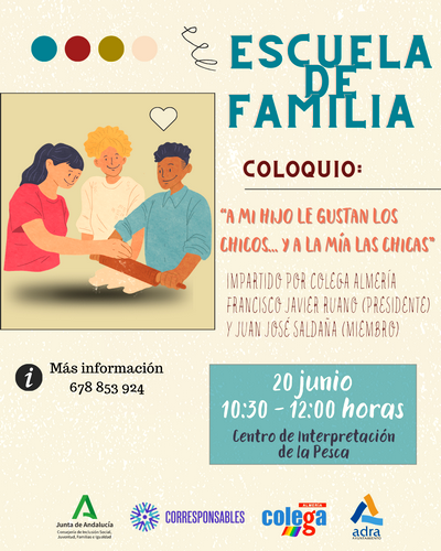 La Escuela de Familia de Adra continúa su programación el próximo jueves, 20 de junio, con el coloquio ‘A mi hijo le gustan los chicos… y a la mía las chicas’, enmarcado en el Día Internacional del Orgullo LGTB que se conmemora cada 28 de junio. Será en el Centro de Interpretación de la Pesca de 10:30 a 12:00 horas, de la mano de Francisco Javier Ruano y Juan José Saldaña, presidente y miembro, respectivamente, de la Asociación COLEGA Almería.