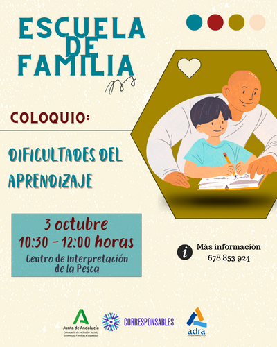 La Escuela de Familia de Adra continúa con la programación el próximo jueves, 3 de octubre, con el coloquio ‘Dificultades del aprendizaje’. Una charla en la que estarán presentes la Presidenta de AXDIAL (Asociación de Dislexia y otras Dificultades de Aprendizaje en Almería), Dña. M.ª Ángeles González, y la orientadora del Equipo de Orientación Educativa Especializado ( EOEE) en Dificultades de Aprendizaje de la Delegación Territorial de Almería, Dña. Pilar Soler.