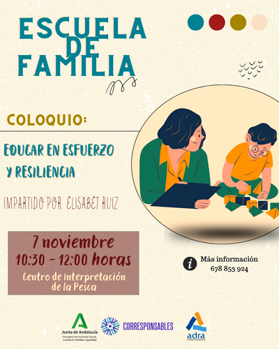 La Escuela de Familia de Adra continúa con la programación el próximo jueves, 7 de noviembre, con el coloquio ‘Educar en esfuerzo y resiliencia’. Una charla impartida por la psicóloga Elisabet Ruiz que se celebrará en el Centro de Interpretación de la Pesca, de 10:30 a 12:00 horas.