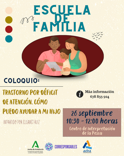 La Escuela de Familia de Adra continúa con la programación el próximo jueves, 26 de septiembre, con el coloquio ‘Trastorno por déficit de atención. Cómo puedo ayudar a mi hijo’. Una charla encabezada por la psicóloga Elisabet Ruiz que se celebrará en el Centro de Interpretación de la Pesca, de 10:30 a 12:00 horas.