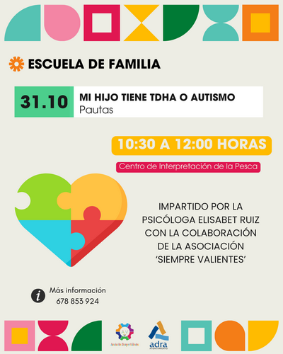 La Escuela de Familia de Adra acoge este viernes, día 31 de octubre, ‘Mi hijo tiene TDHA o Autismo. Pautas’, una charla impartida por la psicóloga, Elisabet Ruiz, en el Centro de Interpretación de la Pesca, de 10:30 a 12:00 horas. Durante esta cita, la ponente hablará sobre la neurodivergencia, en concreto, sobre el trastorno por déficit de atención y el autismo. Los asistentes conocerán todas las características de estos trastornos, las diferentes terapias que existen y su evolución a lo largo de la infancia, adolescencia y la adultez.