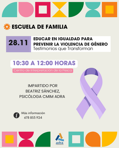 La Escuela de Familia de Adra se despide este viernes, 28 de noviembre, con un coloquio en el marco del Día Internacional de la Eliminación de la Violencia contra la Mujer, que se conmemora cada 25 de noviembre (25N). Bajo el título ‘Educar en Igualdad para Prevenir la Violencia de Género: Testimonios que Transforman’, será impartido por la psicóloga del Centro Municipal de Información a la Mujer (CMIM), Beatriz Sánchez, en el Centro de Interpretación de la Pesca, de 10:30 a 12:00 horas.